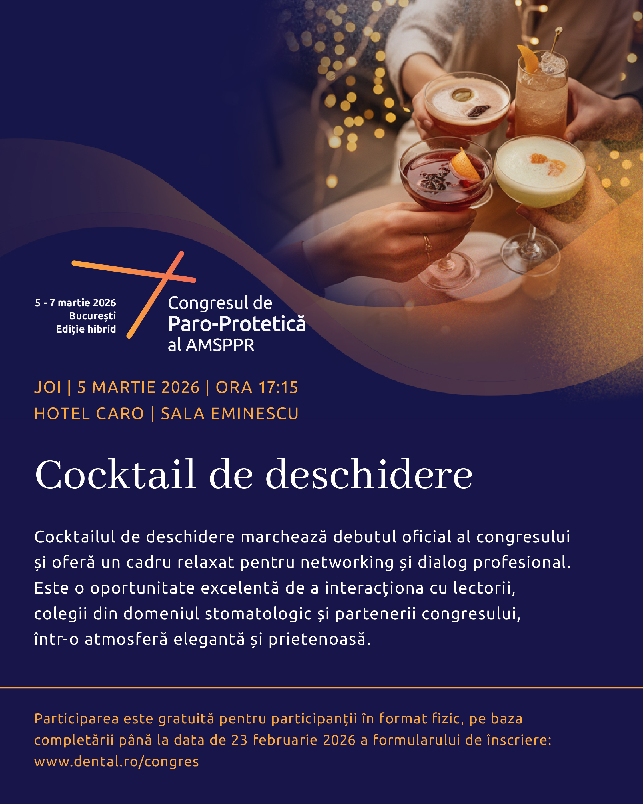 Condiții de înscriere: Pentru participarea la acest cocktail trebuie să te înscrii la evenimentul Congresul de paro-protetică al AMSPPR 2026, 5-7.03.2026