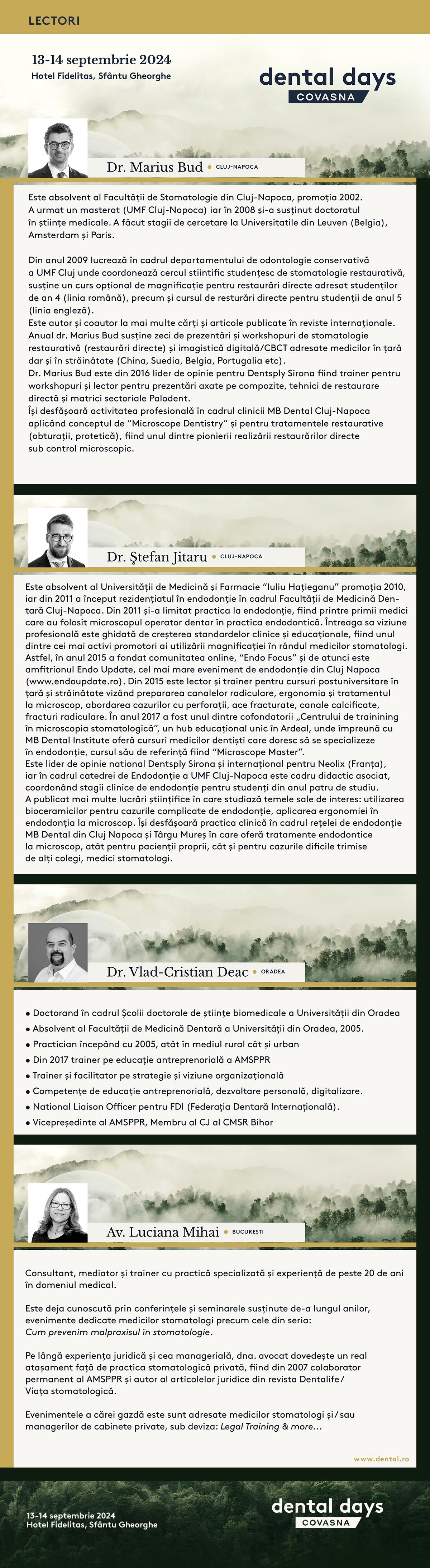 Dr. Marius Bud este din 2016 lider de opinie pentru Dentsply Sirona fiind trainer pentru workshopuri si lector pentru prezentari axate pe compozite, tehnici de restaurare directa si matrici sectoriale Palodent.