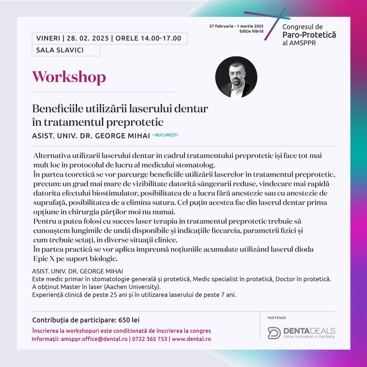 Condiții de înscriere: Pentru participarea la acest workshop trebuie să te înscrii la evenimentul Congresul de paro-protetică al AMSPPR 2025