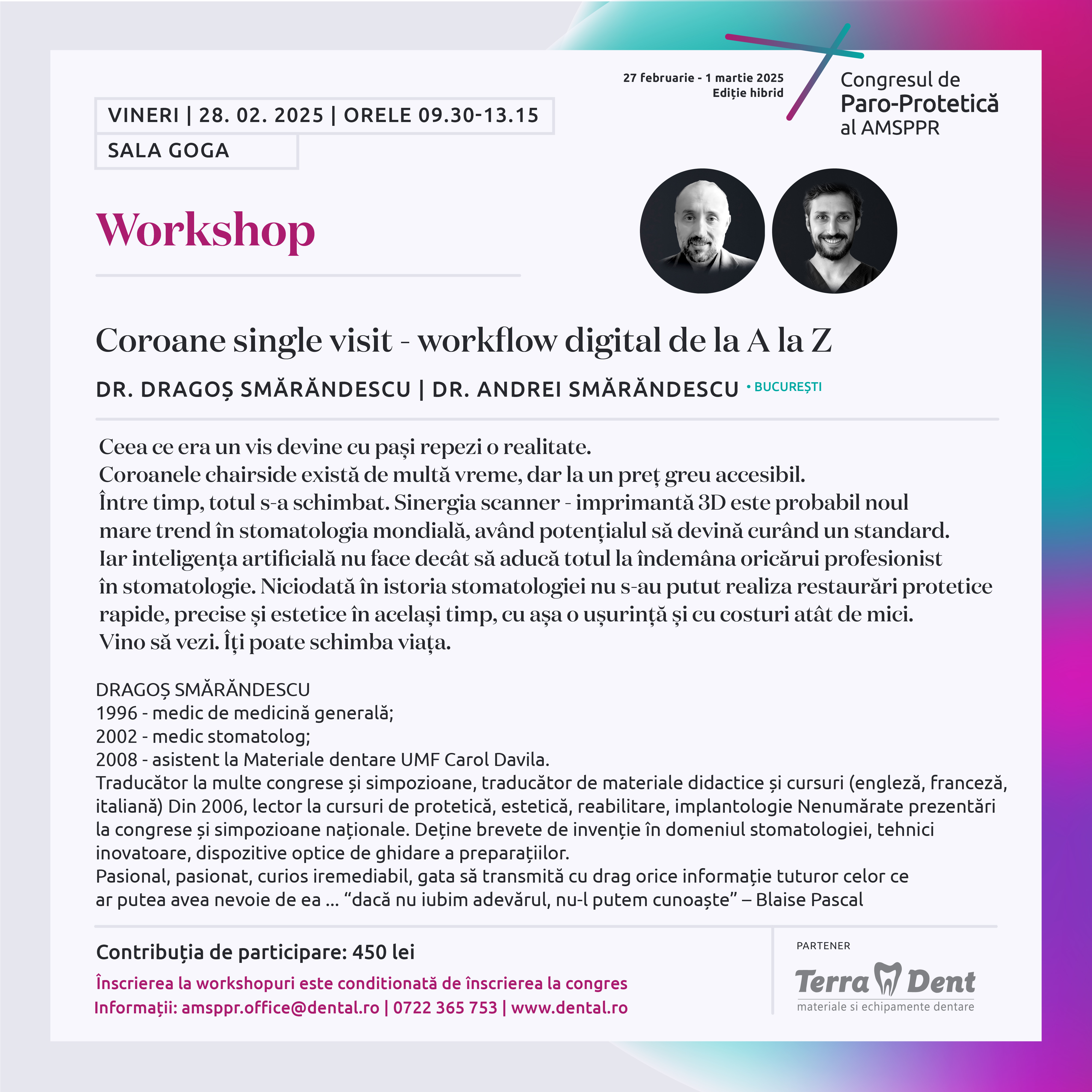 Condiții de înscriere: Pentru participarea la acest workshop trebuie să te înscrii la evenimentul Congresul de paro-protetică al AMSPPR 2025