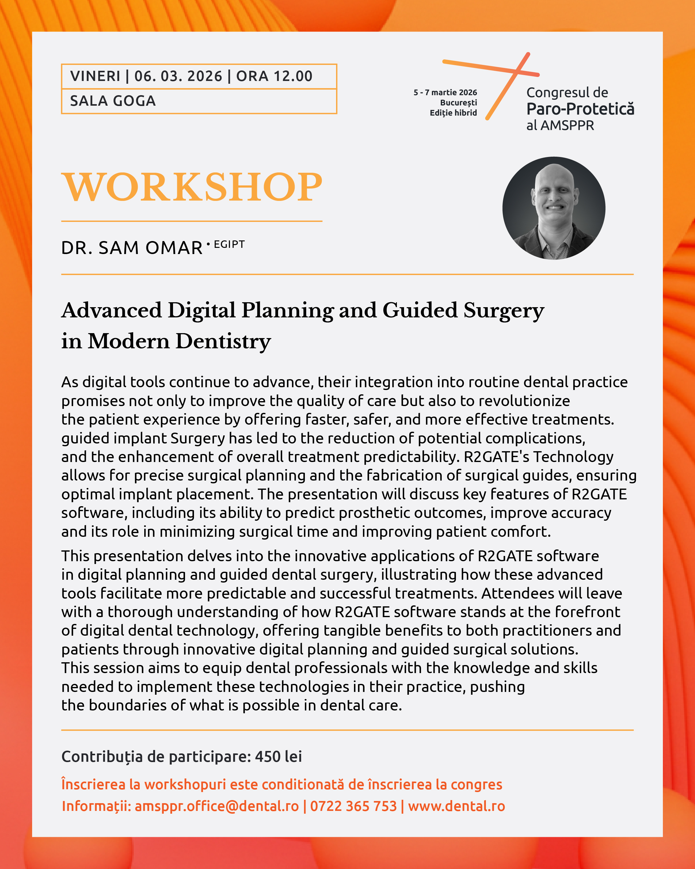 Condiții de înscriere: Pentru participarea la acest workshop trebuie să te înscrii la evenimentul Congresul de paro-protetică al AMSPPR 2026, 5-7.03.2026