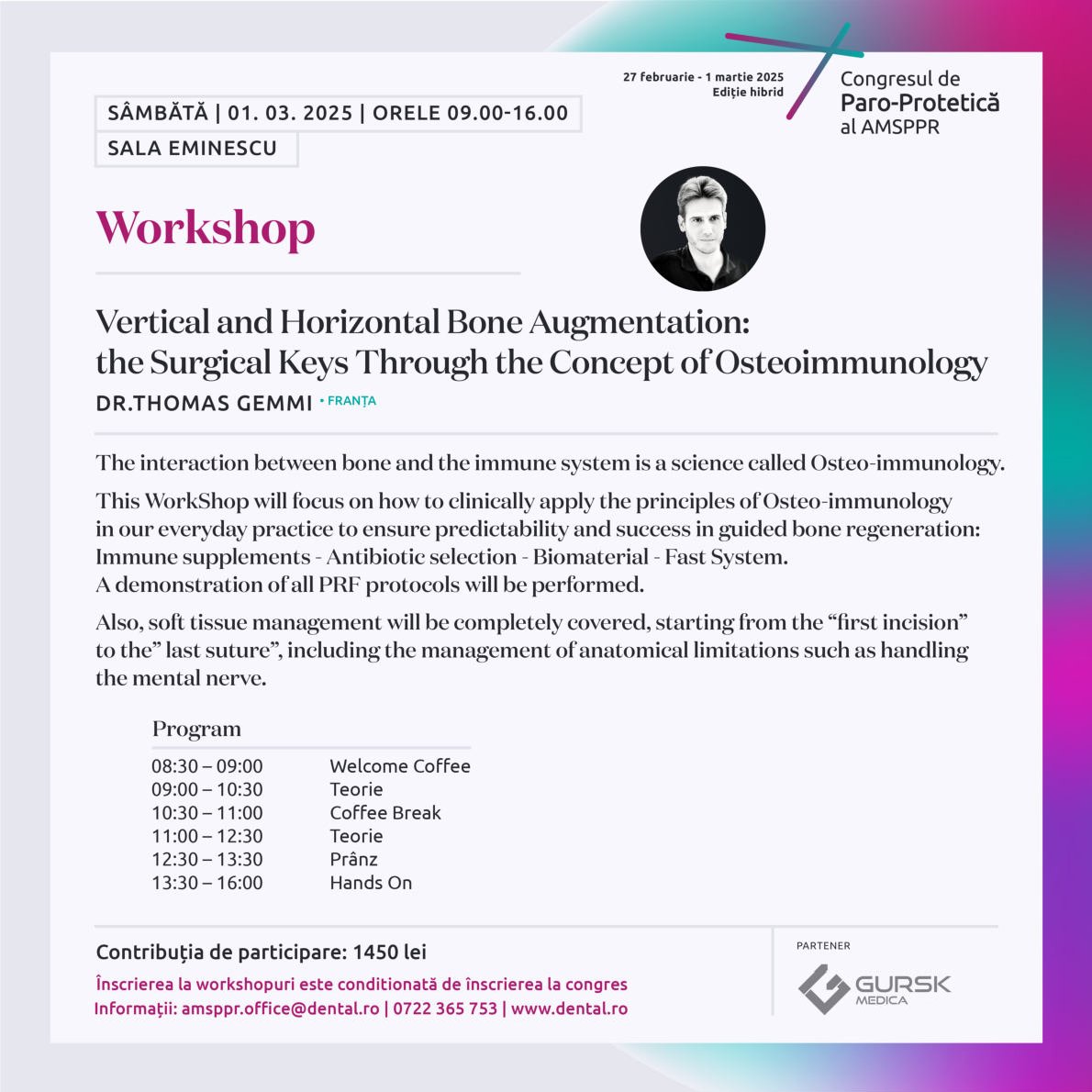 Condiții de înscriere: Pentru participarea la acest workshop trebuie să te înscrii la evenimentul Congresul de paro-protetică al AMSPPR 2025